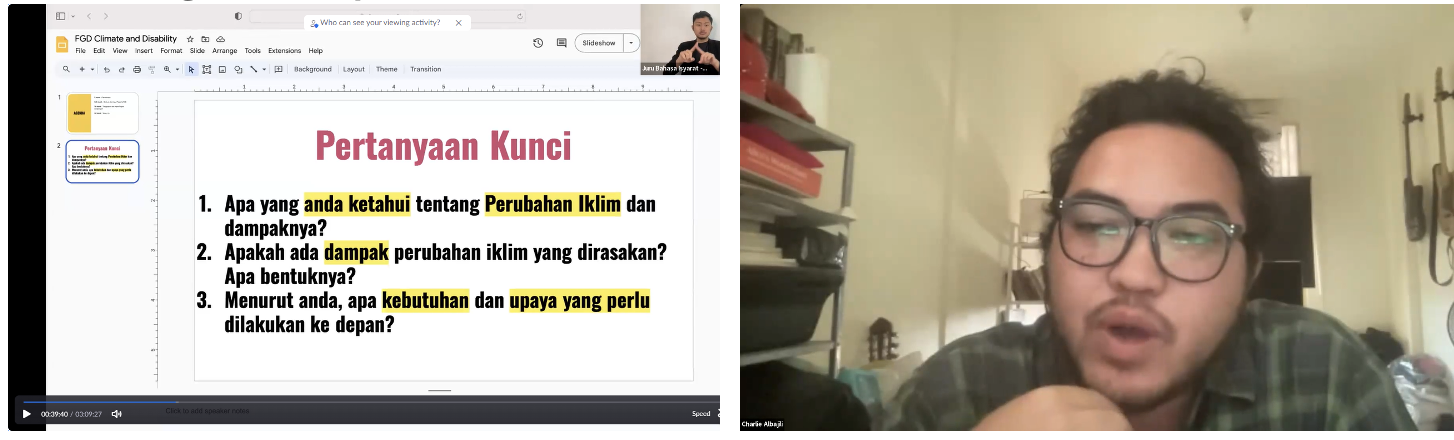 The Focus Group Discussion (FGD) on Inclusive Climate Change Action: Full and Meaningful Participation of Persons with Disabilities was held on August 18, 2023, and was attended by 52 participants. The speakers included Charlie (Greenpeace Indonesia), Siti Maemunah (Environmental Activist, Independent Researcher), and Abdul Ghofar (WALHI).