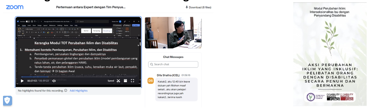 The discussion resulted in a draft climate change module that will be further discussed with cross-disability disability organizations. The Draft of Climate Change Module document can be accessed via the following link:https://drive.google.com/file/d/1yfnUsDNkpF6pX_fmGlPxVEYm7HWFNXGX/view?usp=sharing